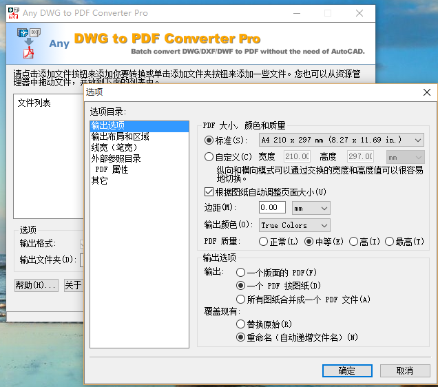 Any DWG to PDF Converter Pro中文版是一个全功能的DWG到PDF转换器,允许你转换DWG,DXF和DWF转换为矢量 PDF 而不需要使用 AutoCAD 。能够批量转换无限数量的DWG / DXF / DWF文件,以高品质的PDF。
