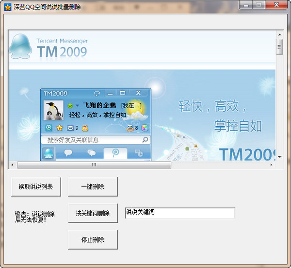 打开深蓝QQ空间说说批量删除,从腾讯TM页面登录QQ空间,之后读取消息列表,可一键删除或按关键词删除。