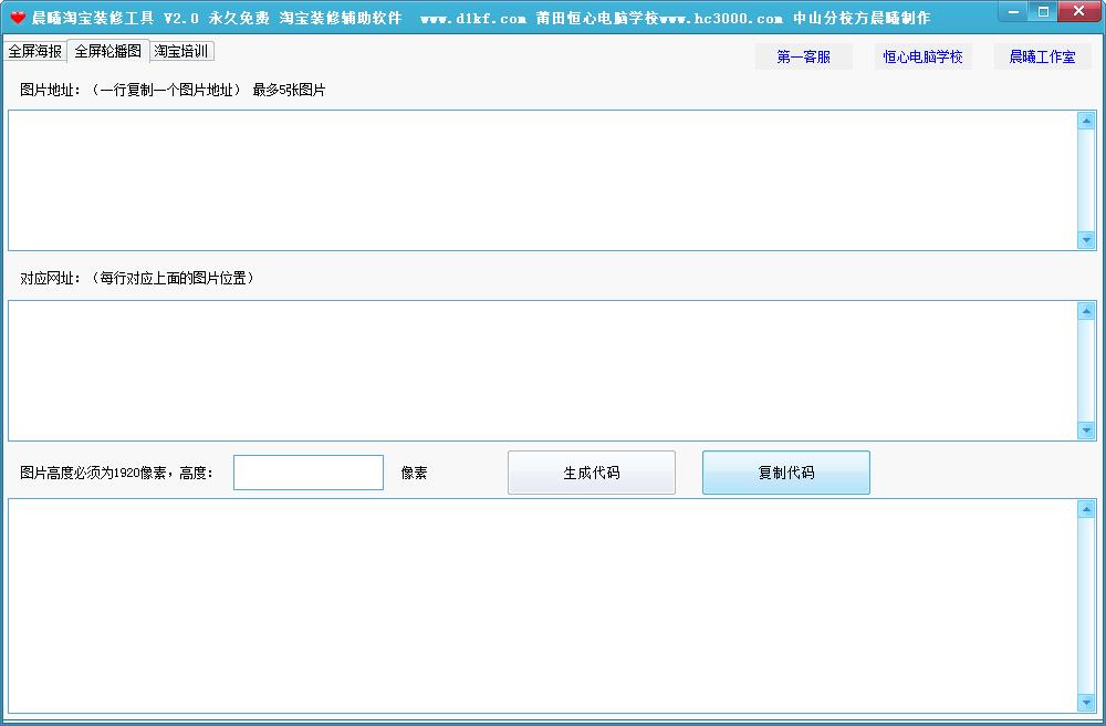 晨曦淘宝装修工具是一款专业且永久免费的淘宝店铺装修软件,这款软件支持淘宝店铺全屏海报和全屏轮播图代码生成,软件永久免费,绝无功能限制,傻瓜化模式生成宽度为1920像素的全屏海报及最多5屏的全屏轮播图广告特效代码,让不懂代码的您快速完成淘宝店铺的美化装修工作。
