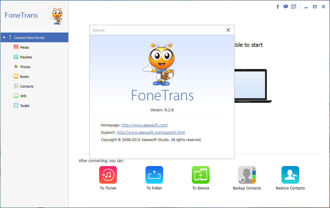 Aiseesoft FoneTrans 是多功能的iOS传输软件,以帮助用户管理在全能上的iPad,iPhone和iPod的iOS数据文件。它能媒体文件(音乐,电影,电视节目,音乐视频,播客,iTunes U专区,铃声,有声读物和语音备忘录),播放列表,照片,相册及图书出口到iTunes(照片和相册除外)或PC。