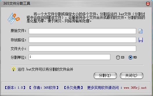 365文件分割工具是一款免费好用、绿色便捷的文件分割器,这款软件可以将一个大文件分割成指定大小的多个文件,运行分割后的文件可以自动合并还原为最初的大文件。分割可以化整为零,便于拷贝、网络传输和处理。将一个重要的文件分割成多个部分后分散收藏,还可以增加原文件的安全性。