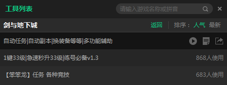 这款新浪剑与地下城辅助,共提供了三款游戏脚本,支持自动任务、自动副本、换装备、1键33级,是剑与地下城练号必备的游戏辅助工具。