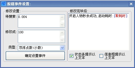 首先创建一个按钮,然后右击按钮,会出现一个菜单,点击菜单里面的”设置事件”,然后会出来一个窗口,在窗口内设定好自己要搜索并修改的浮点数或者字符串.(具体看下面的图解)