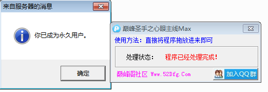 2、接着打开巅峰圣手之心眼主线这个程序,打开之后,会自动那个完成破解,会弹出提示,你已经成为永久用户,点击确定进入辅助界面。
