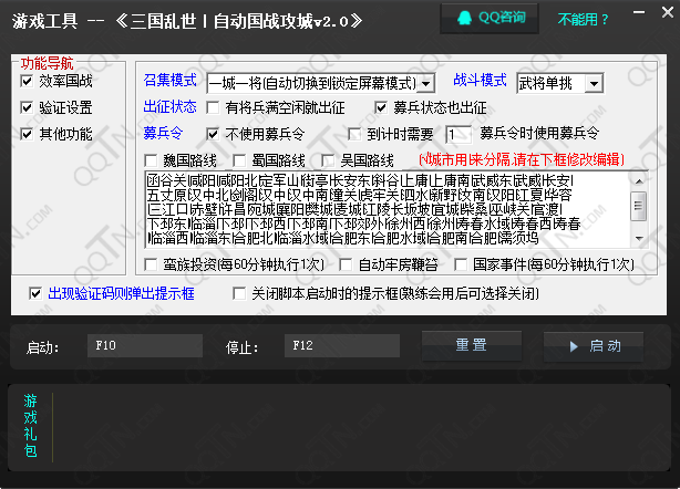 三国乱世自动国战攻城辅助提供高效率国战攻城功能。用户在使用本辅助长时间挂机进行自动国战,支持武将单挑和排队战斗两种战斗模式;支持一城一将(自动切换到锁定屏幕模式)和一城召集全部武将。多样的选择,简单的玩法。辅助挂机国战就是这么方便。