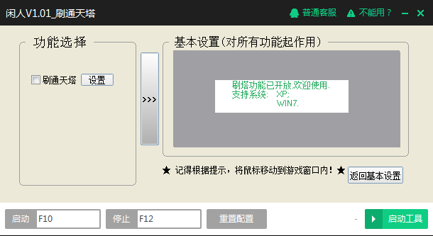 乔峰传闲人辅助专用于刷通天塔,设置好辅助功能后,将鼠标移动到游戏窗口内,按F12启动即可实现自动挂机刷通天塔。