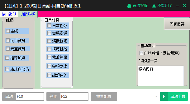 无上神兵狂风辅助提供了练级和日常任务两类挂机功能,共12项功能,此外本辅助提供自动喊话,没13秒喊一次。