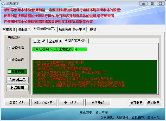 魅影传说辅助脚本主要拥有全能小号和全能喊话两项功能,脚本分为单开和多开单停两个版本,玩家可免费试用。