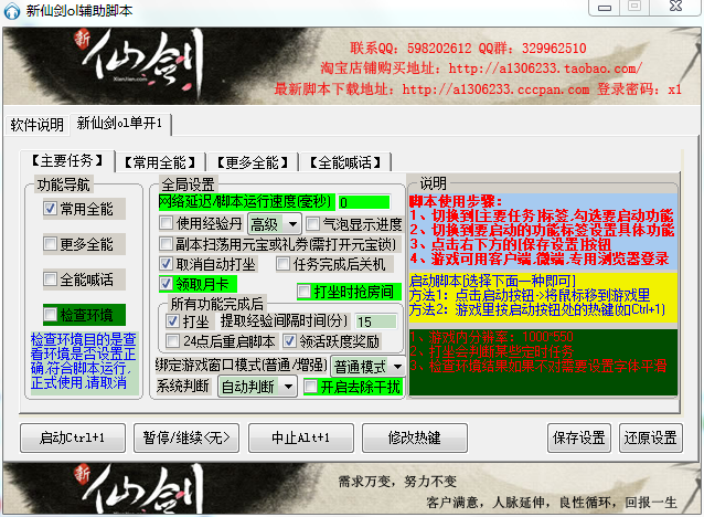 新仙剑OL综合辅助脚本仅能单开挂机,提供了主要任务、常用功能、更多功能及全能喊话等四大类辅助功能,帮助玩家轻松游戏。