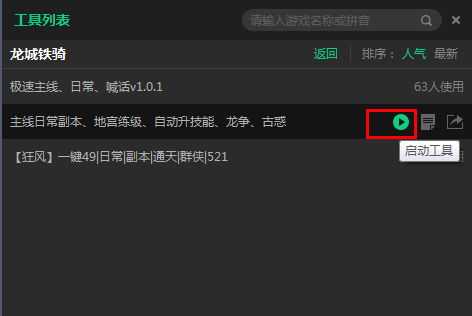 4.在龙城铁骑辅助工具中“启动”“主线日常副本、地宫练级、自动升技能、龙争、古惑”