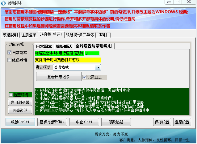 琅琊榜辅助脚本主要提供日常副本和练级喊话功能,本辅助中拥有单开和多开单停两个脚本,其中单开脚本可免费使用。