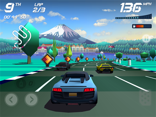 初次进入游戏以及开始比赛后,大多数玩家的反应估计是“赛车游戏的画面还可以这样?”必须承认本作的画面非常独特,如今的赛车游戏为了拟真都在疯狂增加多边形及渲染,而复古的《追逐地平线》却在拼命减少多边形的使用:从车辆到树木、远山、雕像、城市建筑,以及摩擦产生的火花、车尾扬起的尘埃、漫天的飞雪全都是棱角分明,但由于光影效果非常好,所以产生了独特的简约美。