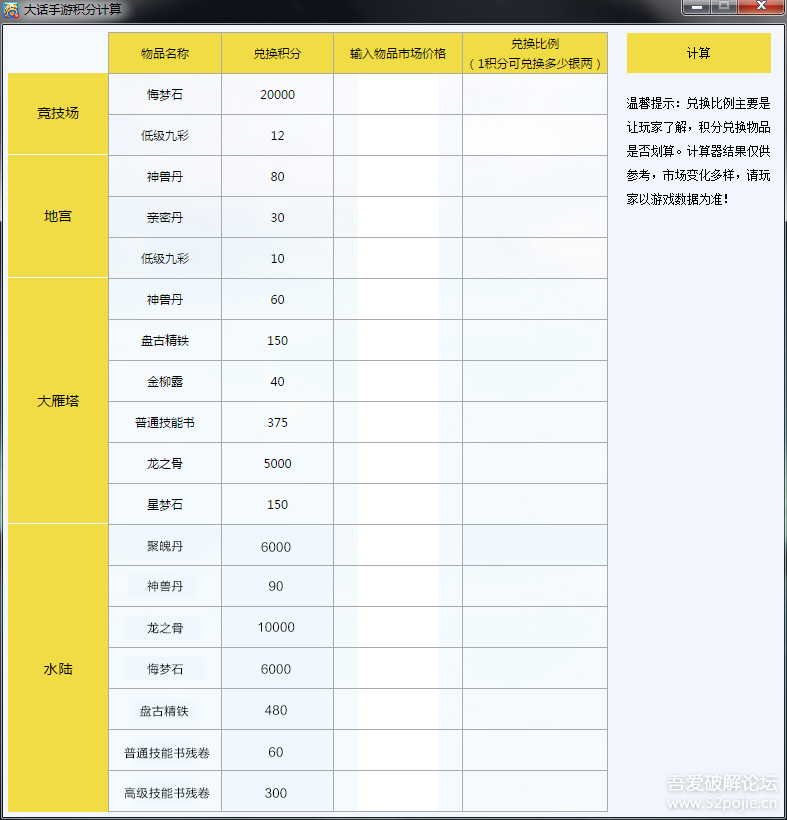 工具包括:仙玉物价换算、副本积分兑换计算、开服表、科举答题