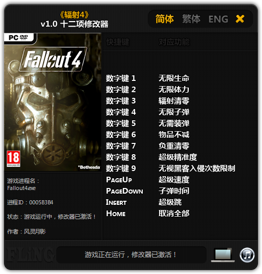 腾牛网本版提供的辐射4修改器来自“风灵月影”,此修改器共提供了12项功能,支持简体/繁体中文以及英文。