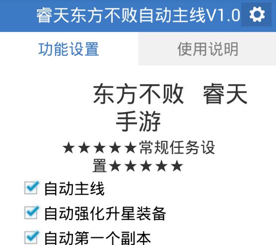 睿天东方不败自动主线辅助是东方不败手游的一款自动辅助工具,这款辅助功能强大,支持自动主线,自动强化,自动升星等等,十分的便捷,详细玩家们一定会喜欢!