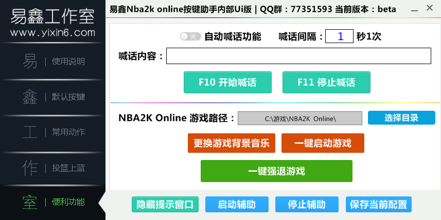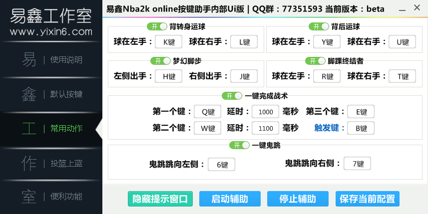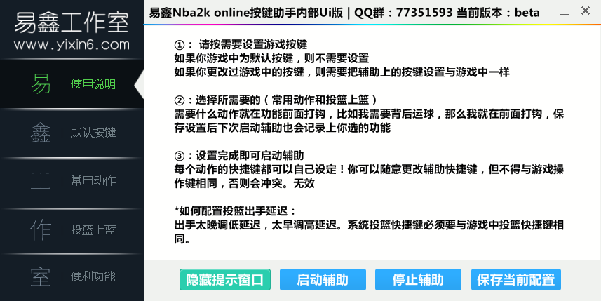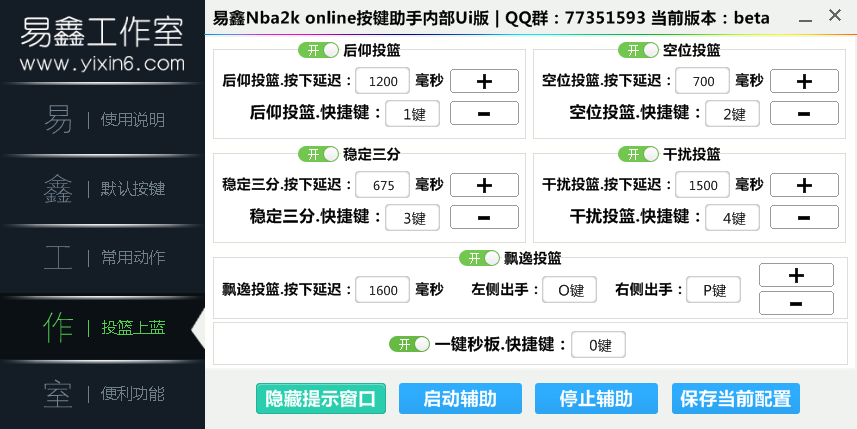 易鑫NBA2Kol按键助手是一款由易鑫工作室专门针对NBA2K online制作的按键精灵脚本,这款按键助手辅助支持一键投篮、上篮、盖帽、抢断、传球、掩护、晃人、包夹、稳定三分、后仰跳投、自动喊话等等功能,新版界面优化,算法优化,增加便利功能,欢迎喜欢玩NBA2K online的玩家朋友下载体验!