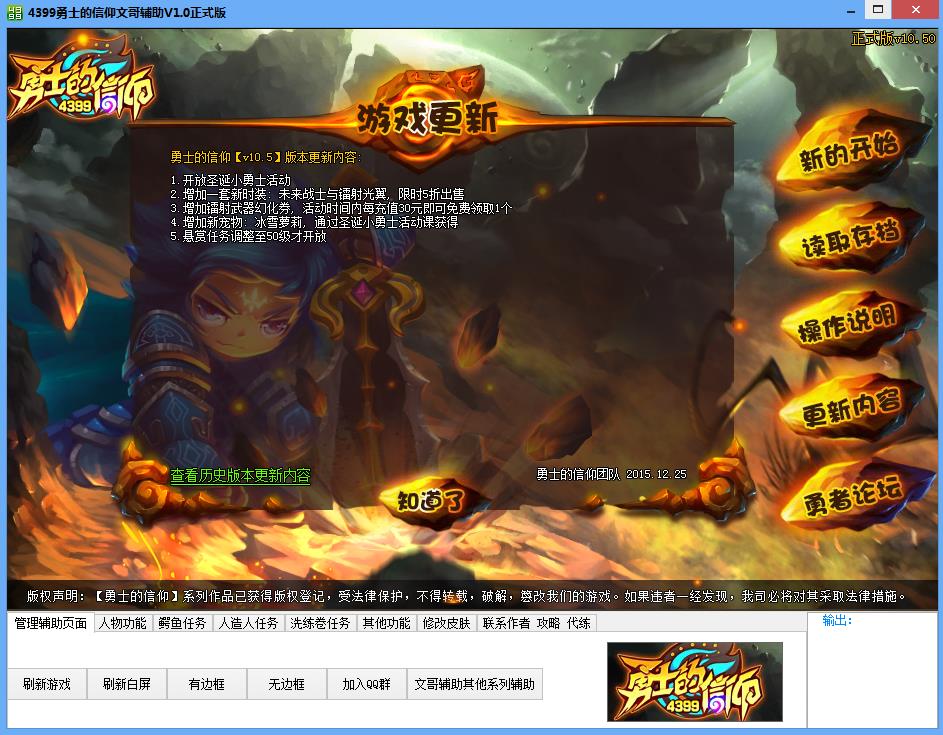 勇士的信仰文哥辅助是专为同名页游4399勇士的信仰推出的一款最新辅助修改器,这款辅助不仅免费,而且功能非常强大,它能够为玩家提供游戏管理、人物功能、鳄鱼任务、修改皮肤等丰富实用功能。玩家通过该辅助能够自由玩耍,获得更多的游戏乐趣,欢迎各位勇士的信仰玩家下载体验!