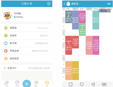 口袋小安完美整合最实用的信息,带你畅游多彩的大学校园; 新功能“一起"拼车、打球、看电影、上自习...有伴了 !