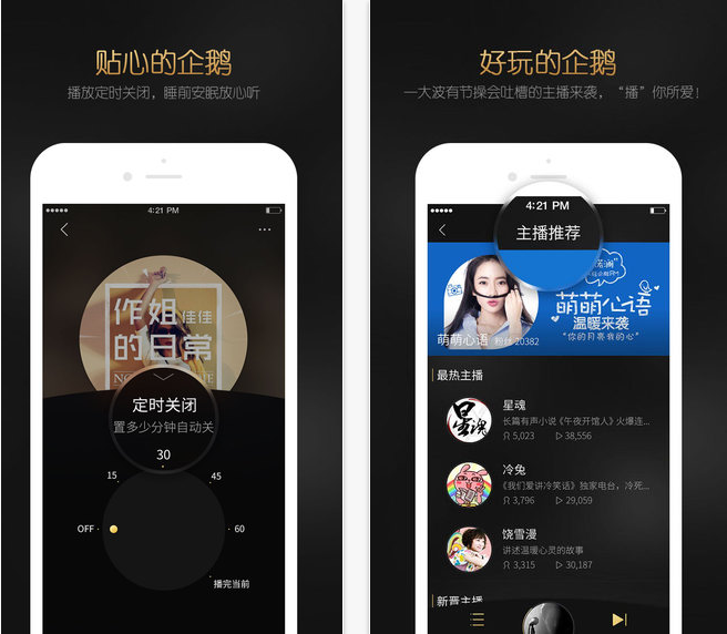 你可以使用企鹅FM收听到精选的有声小说、段子脱口秀、音乐、情感、亲子等内容,还提供按时段推送内容的小电台