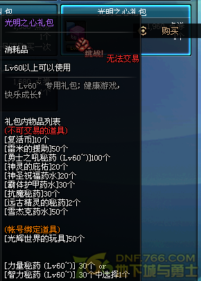 光明之心礼包Lv60以上可以使用,包括复活币10个、雷米的援助50个、勇士之吼秘药100个、神灵的庇佑20个、霸体护甲药水30个、抗魔秘药30个、远古精灵的秘药2个、雪杰克药水50个、光辉世界的玩具50个。