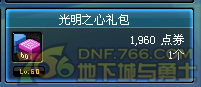DNF上架了光明之心礼包,2013年8月12日更新维护后在商城花费1960点劵获得,下面是详细的礼包内容介绍。