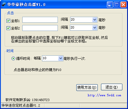 华华豪秒点击器是一款为点击速度要求很快的的用户专门制作的一款点击软,软件最多可以点击2个坐标位置,设置好坐标位置后,按默认的热键F10就可以启动点击器了,点击的速度很快,欢迎需要的朋友免费下载使用!