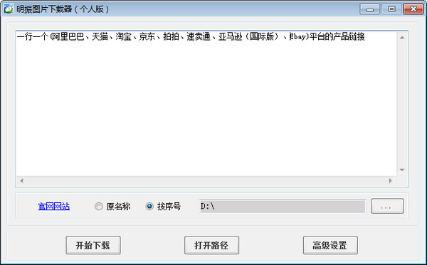 明振图片下载器个人版专门针对大多个人用户开发,是一款适合个人使用的淘宝、天猫、阿里巴巴、速卖通、亚马逊、Ebay、京东、拍拍等平台的图片下载软件。很多网店店主都选择在其他店铺下载宝贝图片,明振图片下载器可以帮助网店店主在淘宝、天猫、阿里巴巴等网站上下载各类需要的图片,支持平台图片一键下载。