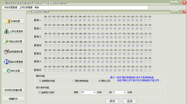 现在有不少学生和小孩都不能控制自己的上网时间,这样容易产生网瘾危害,作为老师和家长必须对学生小孩进行上网管理,在这里小编为大家推荐这款易达学生小孩上网管理软件,这款软件可以帮助你控制小孩的上网时间,保护孩子视力,让孩子安心学习,远离游戏。
