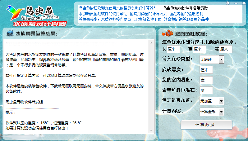 水族精灵计算器是由鸟虫鱼论坛推出的水族宠友必备软件,该软件通过输入的鱼缸水体尺寸,是否加盖和底砂厚度等计算出水体重量,需要照明的功率,过滤的流量数据,重量、照明条件、照明功率、过滤流量、加温功率等等都能统计出来,堪称是是水族宠友必备软件。