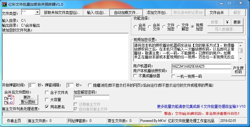 亿彩文件批量加密合并捆绑器是最新的一款文件批量加密合并工具,这款软件不仅可以帮助用户将文件进行批量加密,同时还支持将文件进行快速合并捆绑,被加密的文件除用户外,不允许其他外来用户进行查看,如需查看加密文件,需有用户授权方可进行浏览。