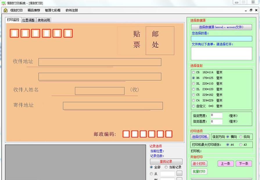 七彩阁信封打印界面简洁、操作方,可以套打B6、C6、C5、C4、DL、ZL等各类标准信封以及各种自定义尺寸的非标准信封,还可以根据需要调整打印位置、字号、字体、间距、收信人的邮政编码、地址、姓名,既可以手工输入、逐一打印;也可以保存在access或excel中,一次性导入到软件中批量打印,高效快捷、省时省力。