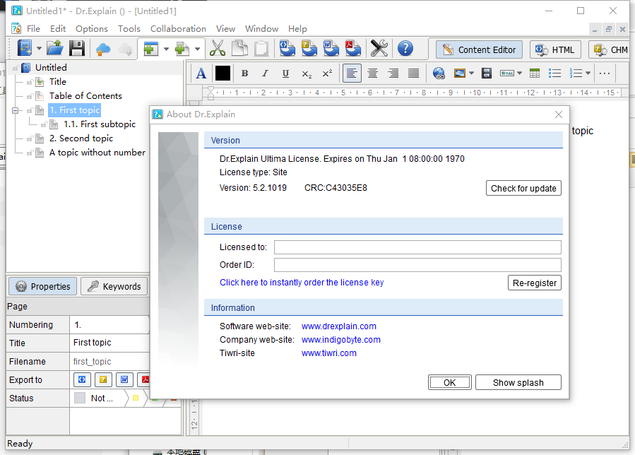 Dr.Explain是一个软件,将帮助您创建CHM帮助文件,HTML在线手册和RTF和PDF格式打印手册。