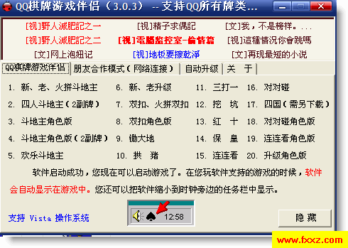 QQ斗地主(1和2副牌),QQ火拼斗地主,QQ欢乐斗地主,QQ斗地主角色版,QQ升级,QQ双扣,QQ双扣角色版,QQ火拼双扣,QQ锄大地,QQ拱猪,QQ三打一,QQ挖坑,QQ红十,QQ保皇,QQ对对碰,QQ连连看(单层/双层),QQ对对碰角色版,QQ连连看角色版。