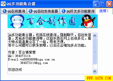 QQ多功能集合器,包括在线查询,强制聊天,自动发信息,其他多功能查询等,这些东西在网上也很多见,最大特点就是集合在了一起,用来方便。