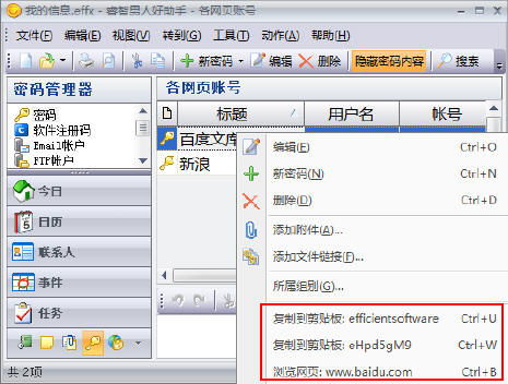 2.添加完成后,右键单击这条记录,就可以把您的用户名或密码复制到剪贴板,也可以直接访问您记录的网址。
