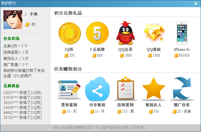 使用QQ装扮神器,还可以通过完成登录签到、分享装扮、连续签到、装扮达人、推广任务赚取积分,可以兑换Q币、话费、QQ会员、QQ黄钻、iPhone5s奖励。