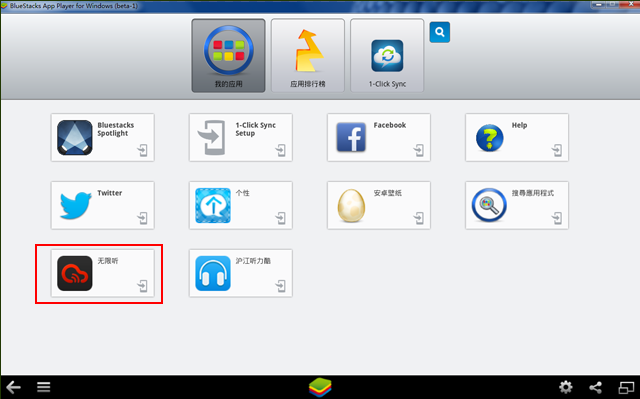 第四步:成功后,打开安卓模拟器BlueStacks,如下图中所示,点图标,就可以电脑上运行《无限听》啦!