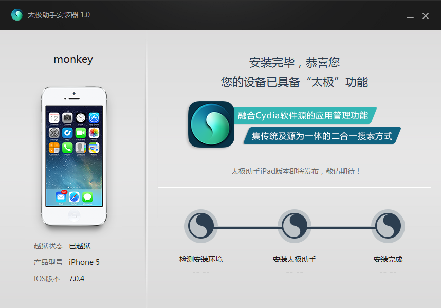 太极助手安装器是针对已越狱的主流苹果设备,安装、更新最新版太极功能的PC端工具,太极助手,兼容IOS7系统且与Cydia越狱无冲突,请放心安装!