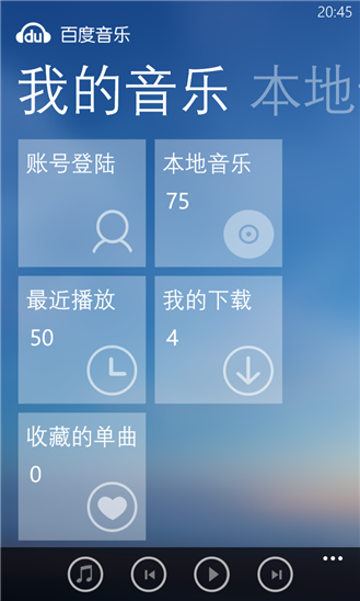 百度音乐全新推出完美契合WP系统风格的音乐应用,完美音质,流畅体验。在线音乐搜索,音乐排行版,音乐分类,歌手分类,新碟上架,本地音乐、在线音乐、个人音乐,页面内容更加丰富; 歌曲播放页功能更强大、界面更美观;百度音乐WP版,让你听到极致。