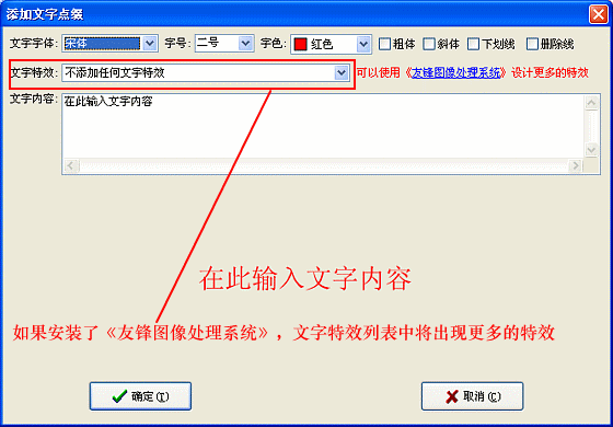在添加文字点缀时,可以在“文字特效”列表中选择一些文字特效,《友锋电子相册制作》默认只带了少量文字特效,如果您安装了《友锋图像处理系统》,特效列表中会有更多的特效。