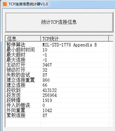 TCP连接信息统计器使用非常简单,只需点击软件正上方的“统计TCP连接信息”按钮即可立即显示,段转播,传入的错误,最大超时,最大连接等统计值。