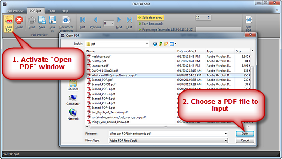 1、导入需要分割PDF文件,单击“加载PDF”选择一个PDF文件并点击“open”输入到PDF拆分窗口。