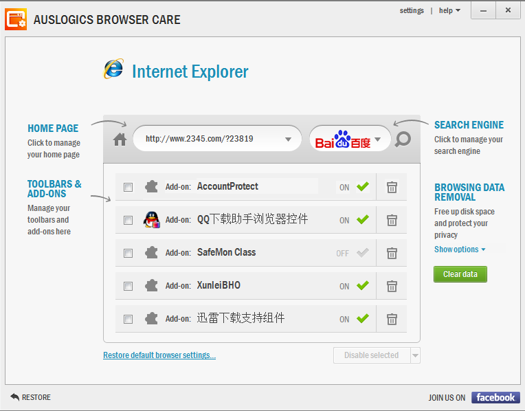 Auslogics Browser Care是一款专业清理维护管理浏览器的工具,可以清理浏览器的缓存垃圾文件、清除各种浏览器工具栏、控件、工具组件,可以查看电脑安装删除程序日志,可以对系统运行操作数据进行备份,工具支持IE、火狐、谷歌等主流浏览器维护管理。
