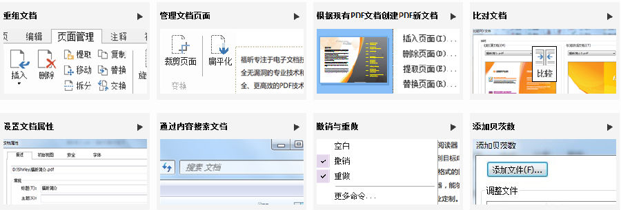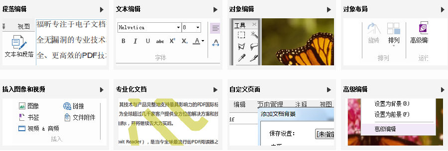 1、段落编辑、文本编辑、对象编辑、对象布局、插入图像和视频、专业化文档、自定义页面、高级编辑