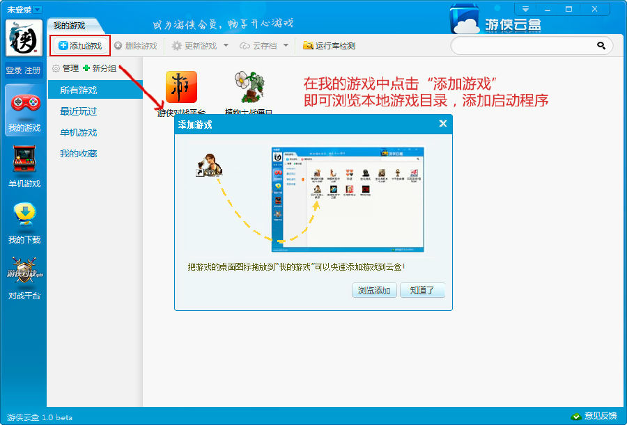 将桌面上游戏的快捷方式或游戏执行文件直接拖入到云盒的“我的游戏”界面即可,点击“添加游戏”可看到图示说明。