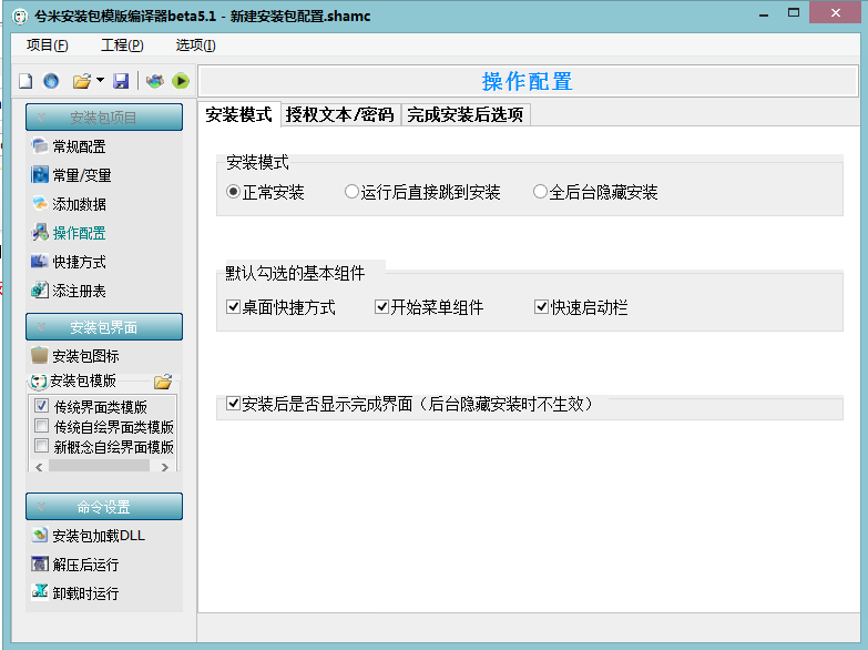 4、操作配置,安装模式,授权文本、密码、完成安装后选项。