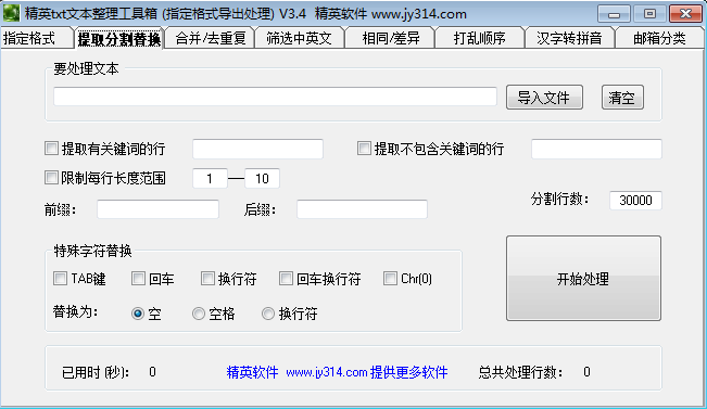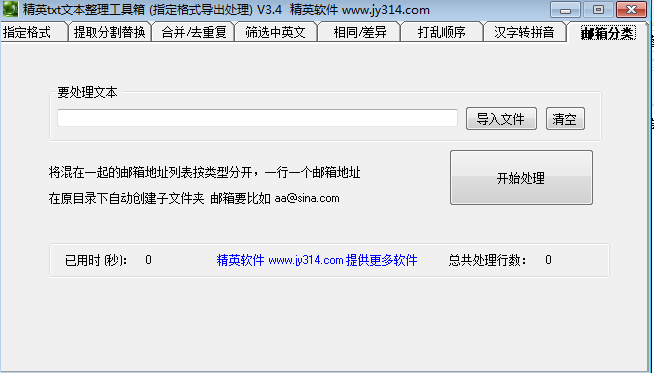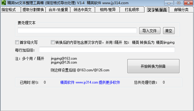 精英txt文本整理工具箱是个多功能的综合文本管理工具,提供了多个文本操作的功能,分割提取替换,合并去重复,筛选中英文,打乱文本顺序,汉字转拼音,邮箱分类等等,可以将各类常用的数据保存到文本里面,使用这款文本整理工具箱进行不同需求的操作,方便实用,能够大大提高你的整理效率。