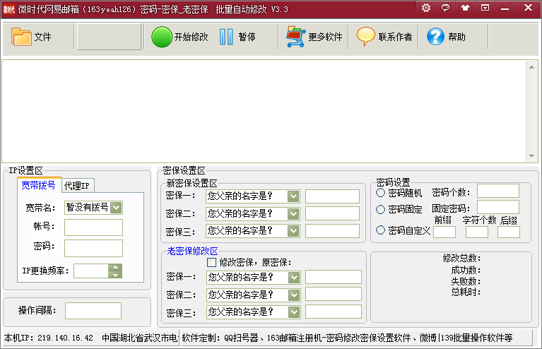 微时代网易邮箱工具是一款专门用于网易邮箱帐号管理的工具。可以用来批量修改邮箱帐号密码、批量上密保、批量改密保,所有操作软件全自动操作。软件一次可以修改1800个,累计修改5000个。功能异常强悍的一款网易邮箱帐号管理工具。