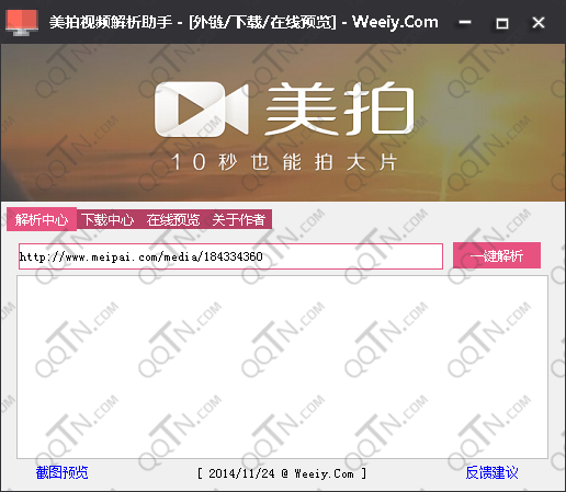 在编辑框中填入你需要解析的美拍链接,即可获得:视频名称;视频简介,视频图片截图,视频上传时间,视频下载外链地址