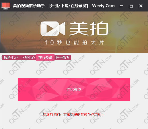 美拍视频解析助手,是微饭系列软件最新作品,用于美拍视频外链地址解析、视频下载以及视频预览使用。提供全方位美拍视频解决方案,将你看到的精彩视频都能免费解析下载保存。喜欢的朋友下载吧!